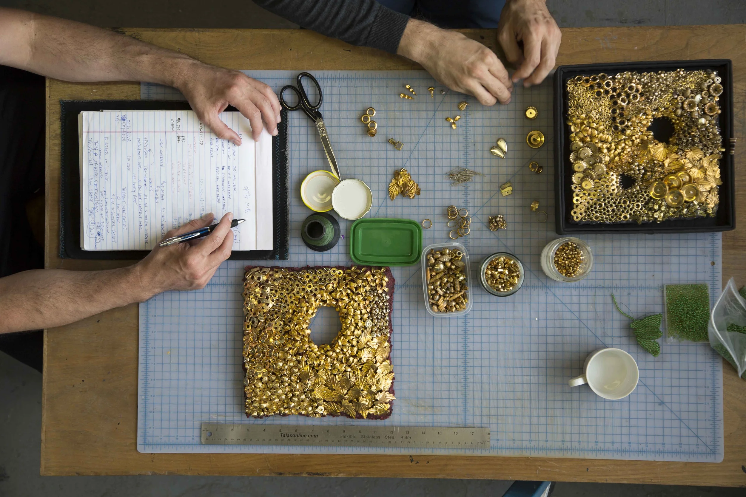 Before we are artists, we are brothers. We are based in New York City, but our large, loving Midwestern family is at the heart of our values and our work. Our art has evolved from meticulously hand-crafted fashion accessories to abstract portraits of shared memories, places, people and experiences. In them, we transform everyday materials, such as belting textiles, used fabric, beads, metal trinkets or paper, into works of art. We share a passion for recycling. We collaborate with glassmakers. We love to sew, bead, brainstorm and draw.